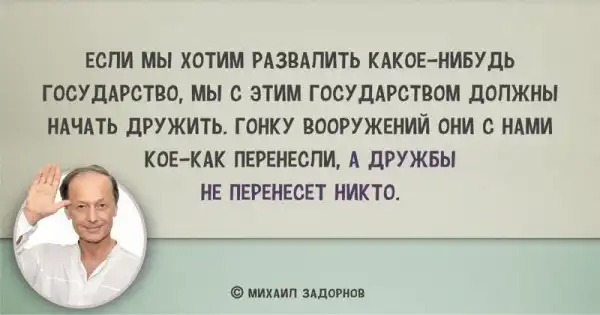 К творчеству Михаила Задорнова можно относиться по-разному, но стоит отметить, что он был настоящим мастером слова. Смешные и грустные, но до сих пор актуальные цитаты писателя. В ней собраны самые, скандальные, спорные, патриотичные, умные (и не очень) мысли обо всем.