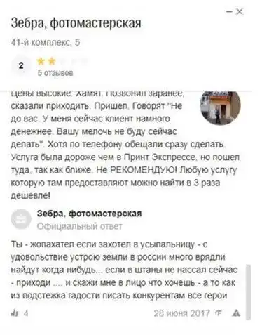 В Набережных Челнах есть фотомастерская «Зебра». Недавно владелец узнал, что может комментировать отзывы на 2гис...