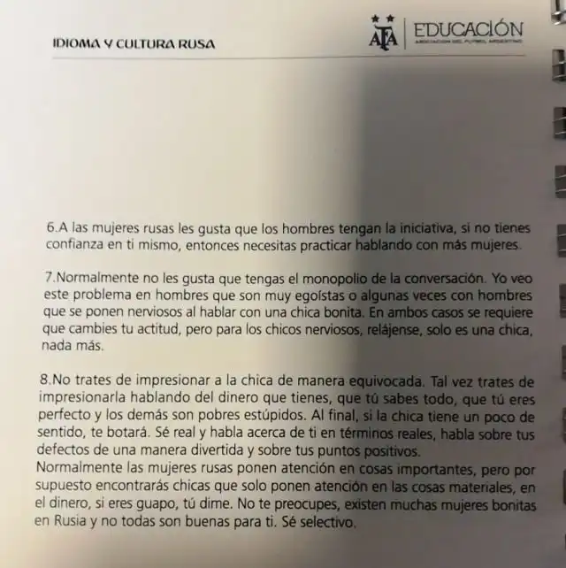 К предстоящему чемпионату мира по футболу, который в этом году пройдет в нашей стране, Аргентинская футбольная ассоциация (AFA) готовит своих футболистов и журналистов к поездке в Россию. На одном из курсов подготовки участникам раздали брошюры, в которых был отдельный раздел о том, как понравится русским девушкам. Фото брошюры разлетелись по сети, что вызвало скандал, после которого ассоциации пришлось извиняться и убирать данный пункт из памяток. Давайте взглянем на советы, которые, как утверждают авторы, помогут аргентинцам в завоевании сердец наших девушек.