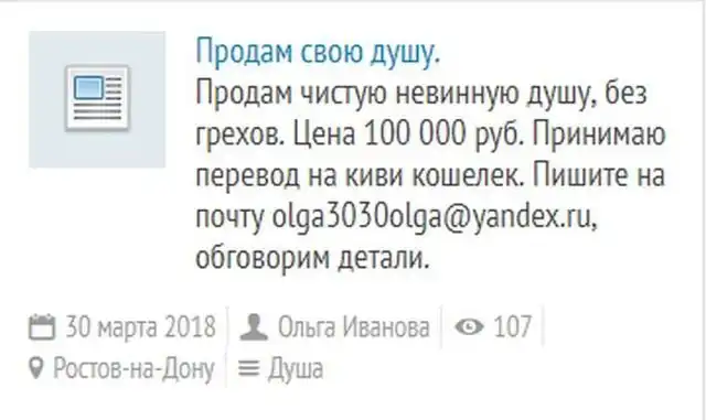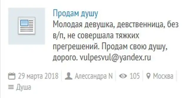 Ни для кого не секрет, что существуют специальные сайты, на которых люди могут найти доноров крови, плазмы и даже стволовых клеток. Но теперь в России появилась такая услуга, как "продажа души", прямо как в мультсериале "Симпсоны", и в этом разделе уже появляется большое количество объявлений. Причем, стоимость души варьируется от нескольких сотен тысяч рублей до нескольких сотен тысяч долларов.