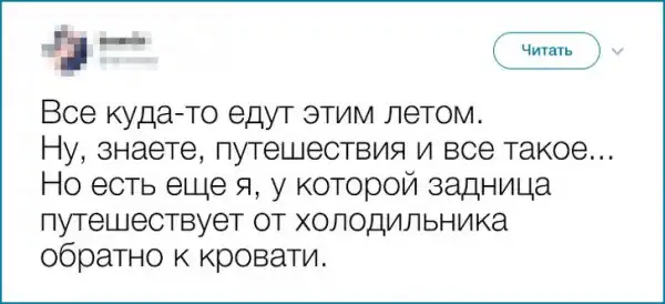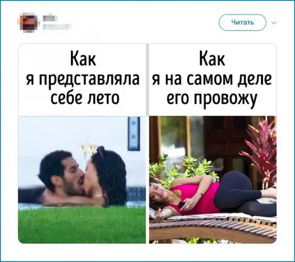 Все мы мечтаем о лете — жарком сезоне, полном приключений и веселья. Наконец-то отправиться в заслуженный отпуск, отдохнуть с дорогими нам людьми и в целом провести лето так, чтобы вспоминать еще целый год. Но в итоге все выглядит совсем иначе. Интернет-пользователи поделились смешными летними реалиями, в которых каждый из нас узнает себя.