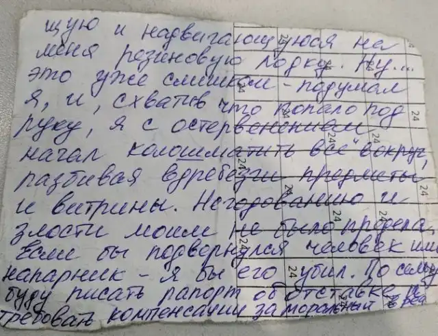 Читая такую объяснительную о произошедших ночью событиях, хочется предложить этому охраннику писать романы, а не охранять магазины по ночам. Такого мастерства изложения, а также неожиданных финальных требований от начальства мы уже давненько не видели.