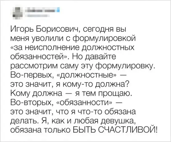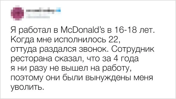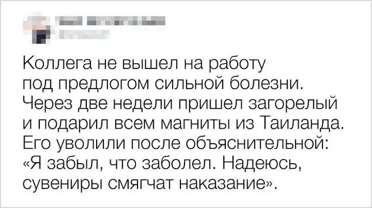 В 2001 году уэльская учительница сказала своим ученикам, что Санта-Клаус — это вымышленный персонаж. Расстроенные ребятишки поведали об этом своим родителям, и те подали на учительницу в суд. За что она и была уволена. Курьезные случаи увольнений случаются довольно часто, об этом может свидетельствовать множество постов в социальных сетях. Так, например, 14 августа известный американский телеведущий Джимми Фэллон даже запустил тред в твиттере «Почему меня уволили», под которым уже отписались несколько сотен человек.