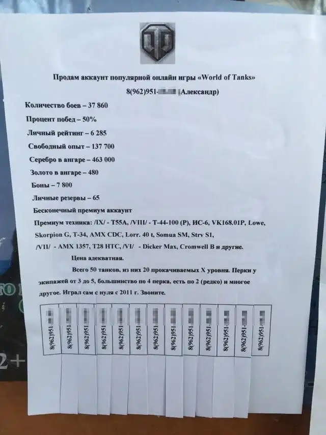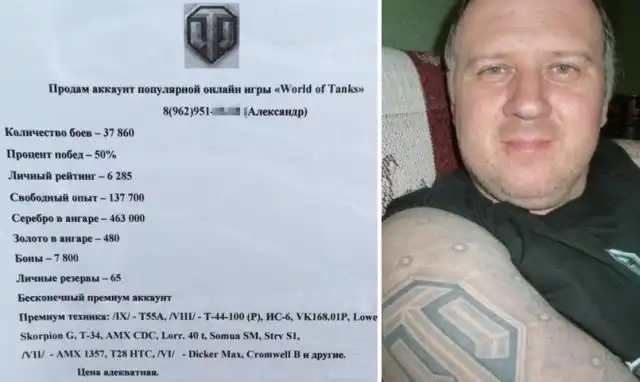 Есть настолько заядлые геймеры, которые начинают проводить в игре не только свое свободное время, но и даже отказываются от всех других увлечений в жизни. В то время, как многие из нас жили, развлекались, путешествовали, отдыхали с друзьями, автор этого объявления целыми днями играл в "танчики". Но, видимо, прошла любовь в игре, и теперь он решился избавиться от своего аккаунта.