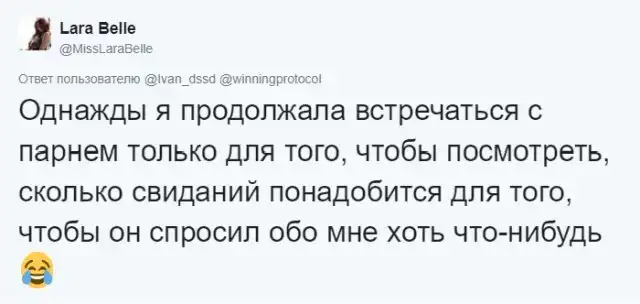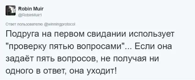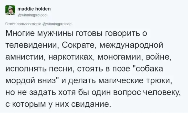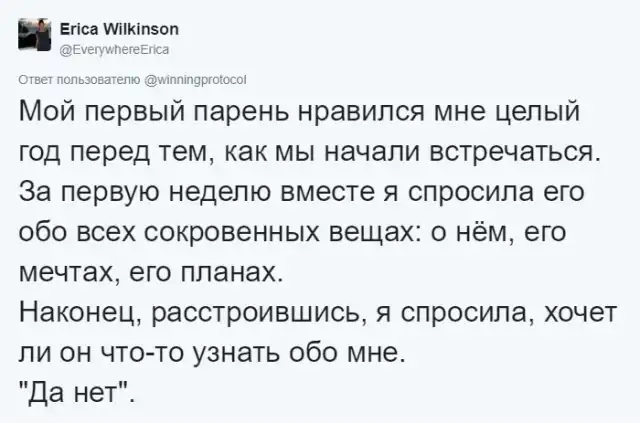 Что может быть важнее в отношениях между парнем и девушкой, чем первое свидание? Ведь именно первое свидание формирует первое впечатление и способствует дальнейшим отношениям. Причем, очень важно не только уметь слушать собеседника, но еще и задавать вопросы, чтобы хоть как-то поддерживать беседу. Ведь иначе все может получиться как у автора этого твита, который вызвал цепочку обсуждений в сети.