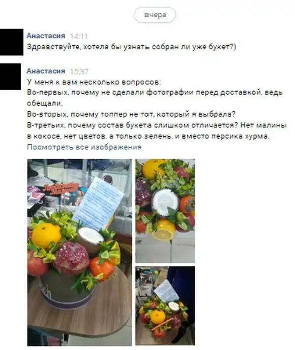 В день доставки ее стали игнорировать, а фотографию перед доставкой так и не отправили. Тем не менее, чуть позже букет доставили, он значительно отличался от показанной ранее картинки.