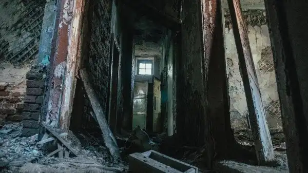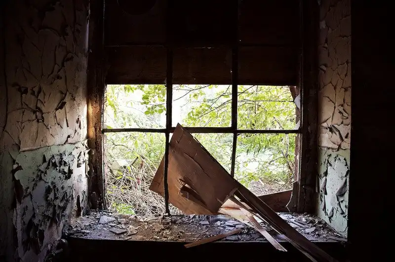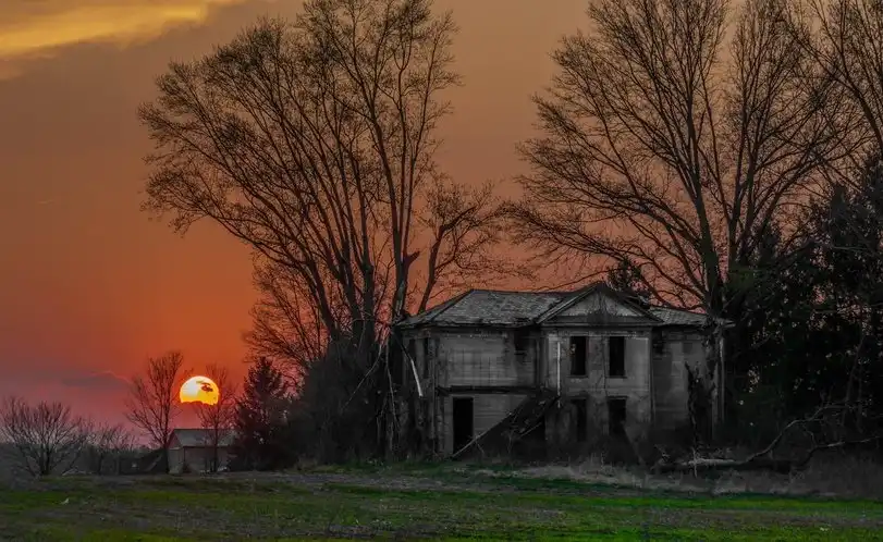 Желтое солнце уже склонившееся к закату освещает этот осенний пейзаж яркими красками апокалипсиса. Люди давно покинули отстроенное жилище. И только ветер сейчас здесь живет, он гуляет по комнатам, разгоняет пыль с мусором и приносит воду, которая постепенно разрушает человеческое строение.