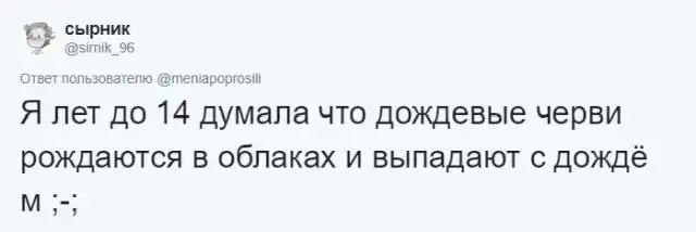 Несмотря на то, что детство - прекрасная пора в жизни каждого человека, это время наполнено не только радостью, но и различными заблуждениями. Пользователи Twitter решили поделиться своими детскими заблуждения о тех или иных вещах, которые точно смогут вызвать появление улыбки на ваших лицах. В каждой из таких историй отчетливо чувствуется вкус разбившихся розовых очков.