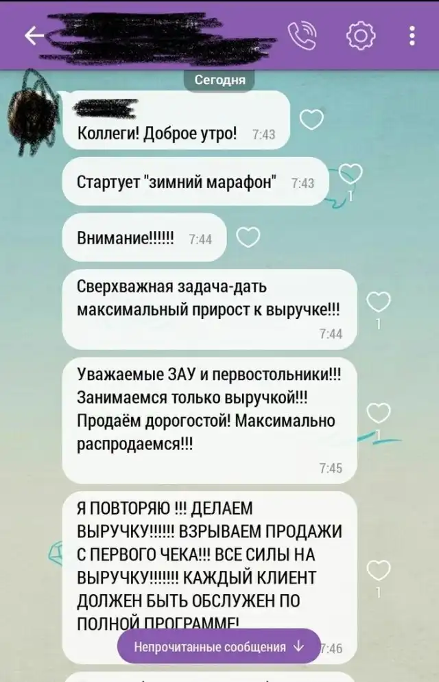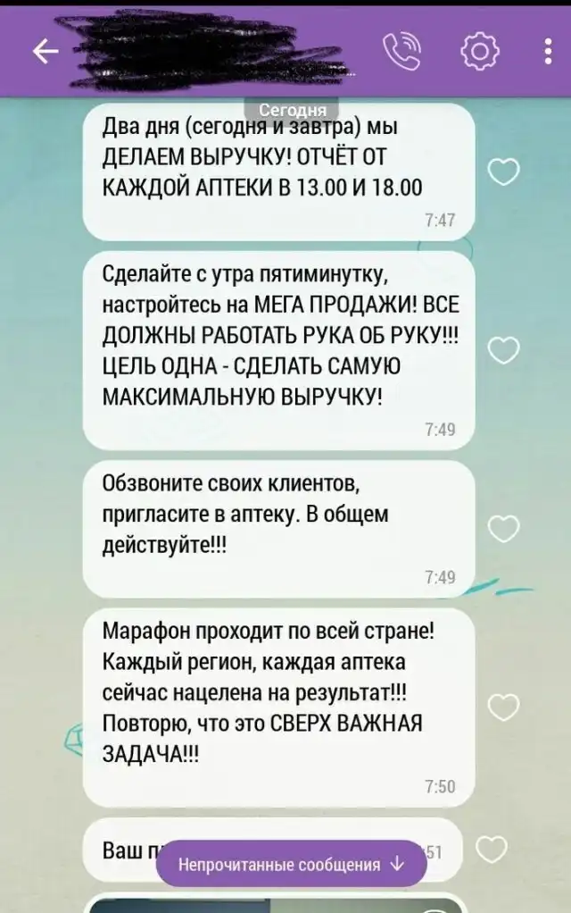Ни для кого не секрет, что конец года беспощаден во многих сферах продаж, когда владельцы ставят довольно жесткие требования своим сотрудникам. В основном, это касается продажи остатков товаров и увеличения прибыли, как и произошло в одной из аптек в Твери. Сотрудник решил поделиться с нами скриншотами внутреннего чата аптеки, в которой он работает. Такой настойчивости начальства мы уже давно не видели.
