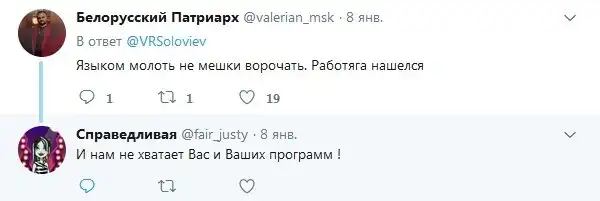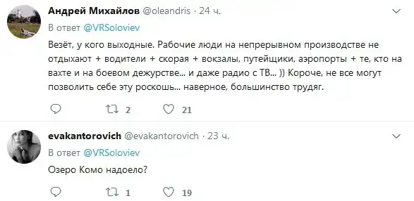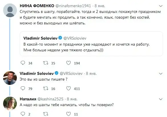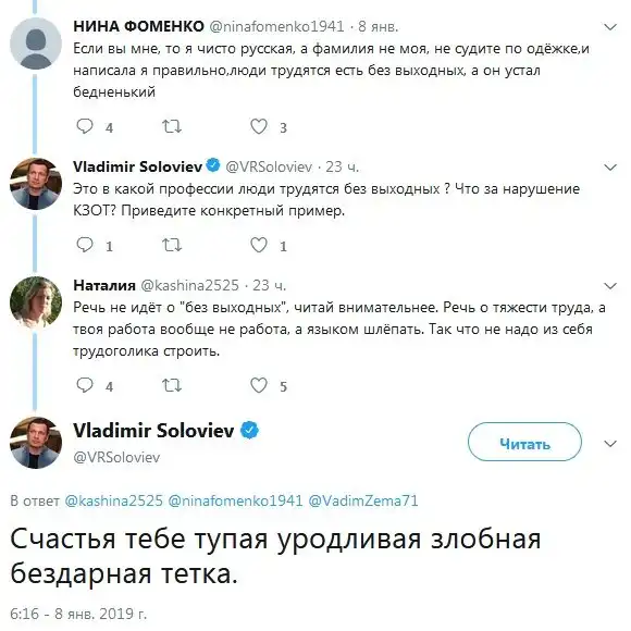Известный телеведущий Владимир Соловьев пожаловался в своем Twitter-аккаунте на то, что он уже устал от праздников и выходных дней, которые ему уже надоели. Конечно же, это не осталось без внимания его подписчиков, которые в штыки восприняли такие высказывания и посоветовали Соловьеву поработать где-то в шахте, а уже потом говорить об "усталости от выходных". Но и телеведущий не стал сдерживаться в высказываниях и грубо оскорбил подписчицу.