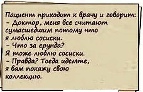 — Вас удовлетворяет ваша работа? — Ну, как вам сказать... Вот иду я на работу, вижу, девушки стоят красивые — хочется! Иду я с работы, те же девушки — не хочется. Наверное, удовлетворяет.