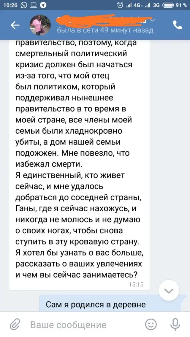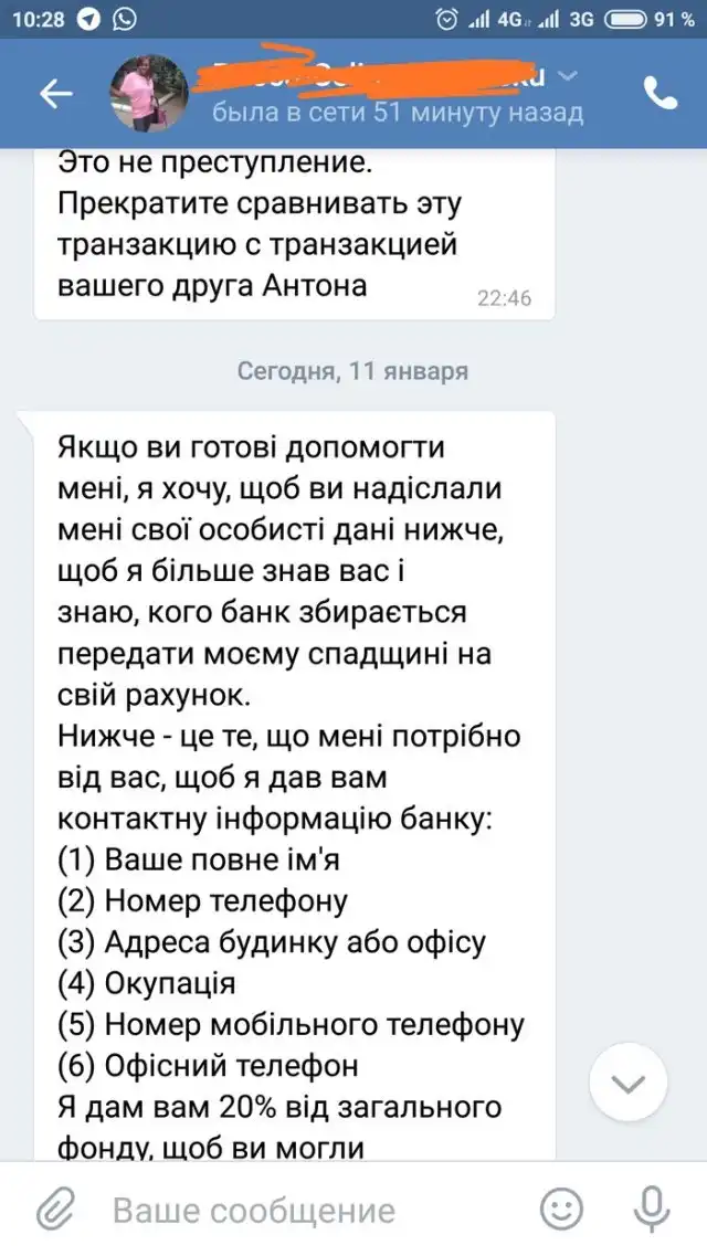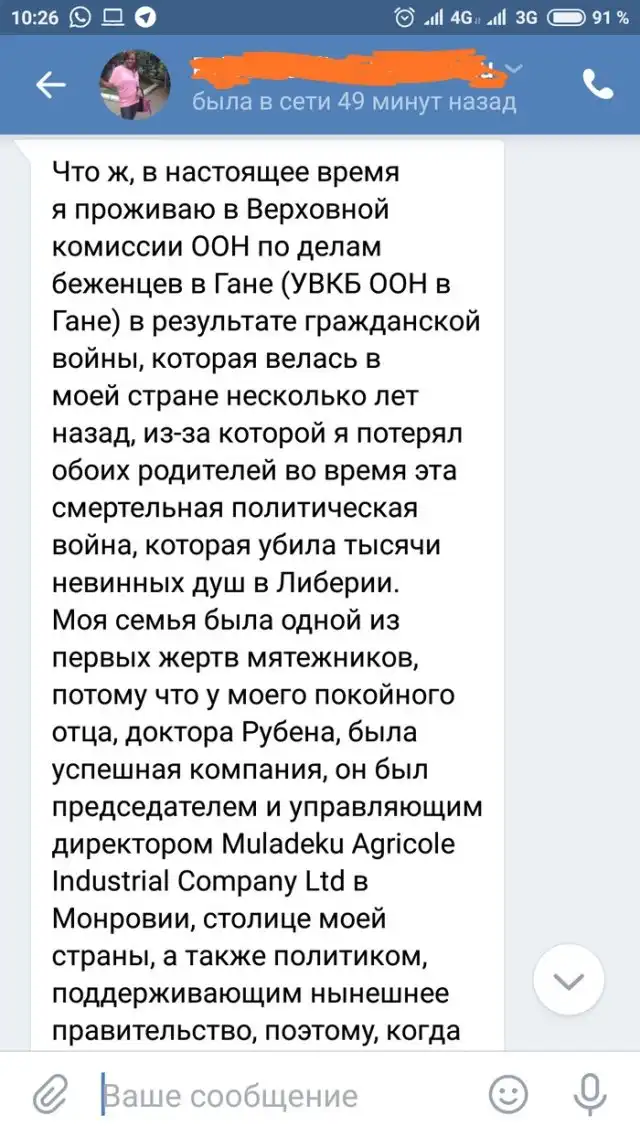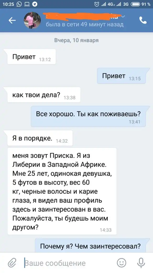 Автор этого поста пишет, что недавно у него состоялся весьма интересный диалог с "беженкой", которая ему обещала "золотые горы", но во время беседы все пошло совсем не так, как планировал мошенник. Неужели до сих пор кто-то ведется на подобные разводы в сети? Читаем далее.