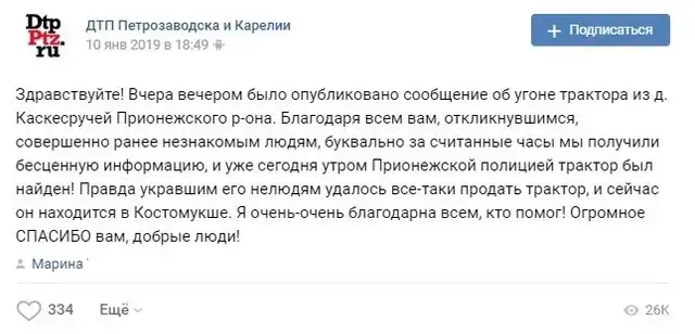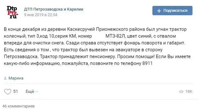 У одного пенсионера имелся трактор Беларус МТЗ 82, который зимовал на улице. Вернувшись в деревню после новогодних праздников, хозяин очень удивился, что его любимый трактор куда-то пропал. Первое, что пришло в голову, трактор угнали. Поэтому он сразу же обратился в полицию, а затем его сын опубликовал в одной из групп в социальной сети объявление с вопросом о том, может, кто-то видел этот трактор.