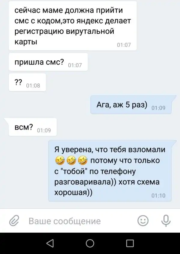 Перед последним сообщение мошенник даже скинул скриншот с мастерски подделанным окном входа в сервис Сбербанка, причем, все выглядело как реальная привязка карты к счету Яндекса. Но затем это было быстро удалено, и автор поста не успела сделать скриншоты.