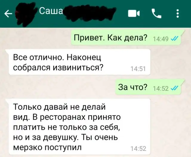 Порой свидание может пойти совсем не так, как хотелось бы, и превращается в настоящий "кошмарный сон". Пара договорилась о встрече в центре города, где собирались вместе пообедать. Все было отлично до тех пор, пока девушка не начала рассказывать про какого-то из своих ухажеров и даже показывать его снимки в Instagram. Парень героически выдержал три часа рассказов о другом замечательном мужчине, а когда принесли счет, он просто взял и заплатил только за себя. Конечно же, подобное решение привело девушку в ярость...