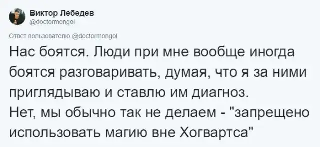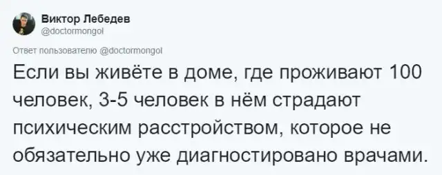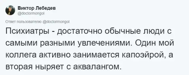 Психиатр по имени Виктор Лебедев уже на протяжении 5 лет работает с различными пациентами, поэтому у него накопилось немало интересных историй и фактов из его практики. Периодически он высказывает свои мысли в социальной сети, почитать самые интересные из которых мы предлагаем вам в продолжении поста.