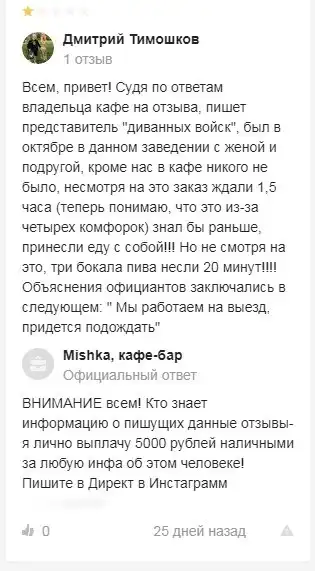 Когда хочешь узнать информацию о каком-то заведении, всегда полезно почитать отзывы в сети. Автор этих скриншотов пишет, что собирался заказать доставку еды и случайно наткнулся на одно кафе. Такие отзывы и ответы владельца заведения очень порадовали и читаются, как настоящий экшен.
