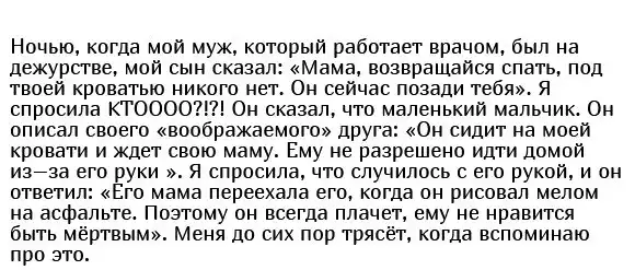 Порой у детей настолько богатое воображение, что их рассказы могут не на шутку напугать родителей. Пользователи социальной сети решили поделиться самыми пугающими и жуткими вещами, которые им рассказывали их дети. От некоторых высказываний и правда на спине появляются мурашки, если представляешь себя на месте родителя, который это услышал.