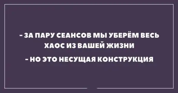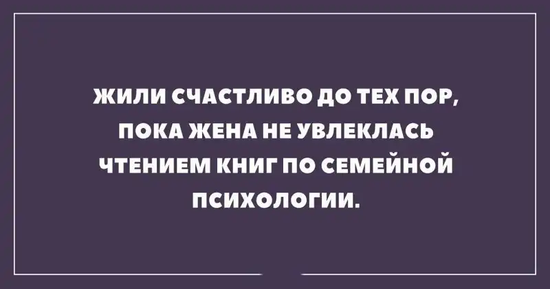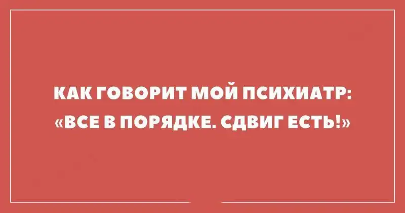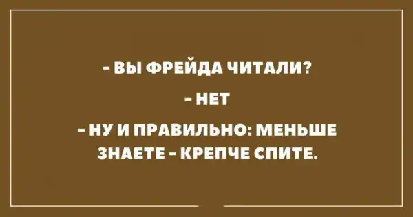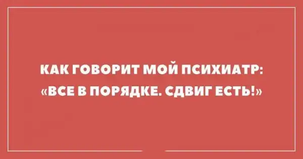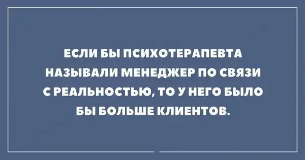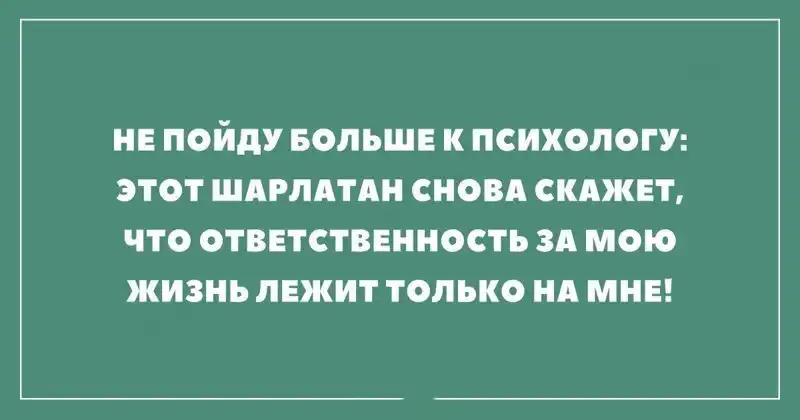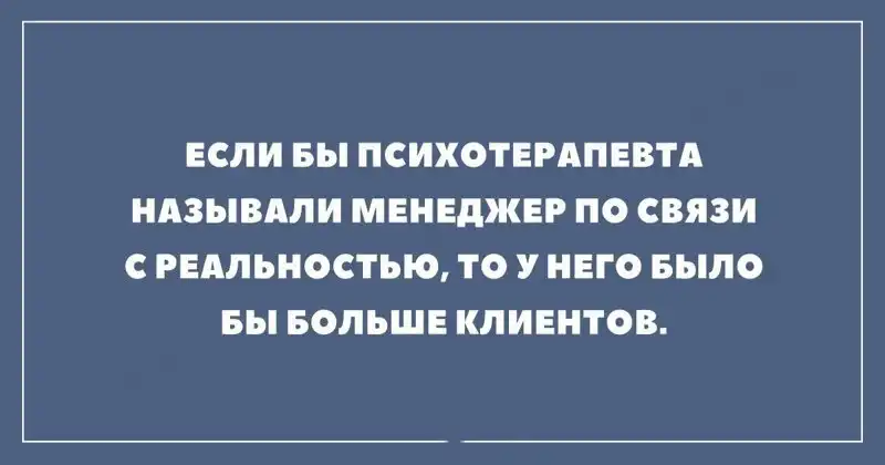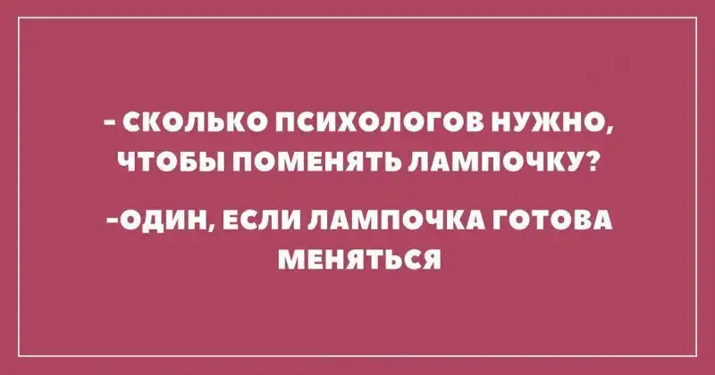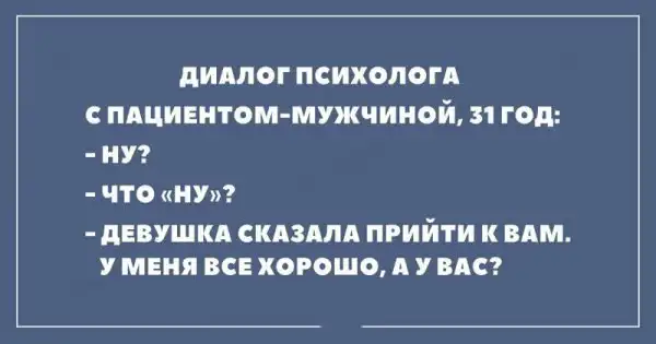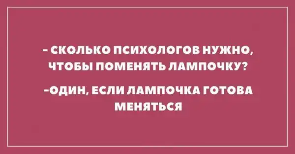 Еще каких-то 15 лет назад никто не признавался, что ходит к мозгоправу. Проблемы обычно решались в кругу семьи и друзей. Сегодня фразу "Мой психолог советует" можно услышать в метро или за соседним столиком в кафе. У психологов и их пациентов есть даже свои шутки, некоторые из них мы собрали в этой подборке под кодовым словом "психоюмор".
