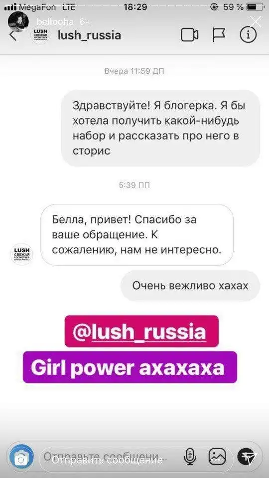 Инстаблогерша Белла Евгеньевна попыталась выпросить у магазина LUSH брендовую косметику. Получив вежливый отказ она начала обвинять всех в унижении и притеснении феминисток.