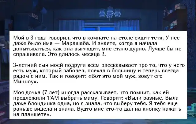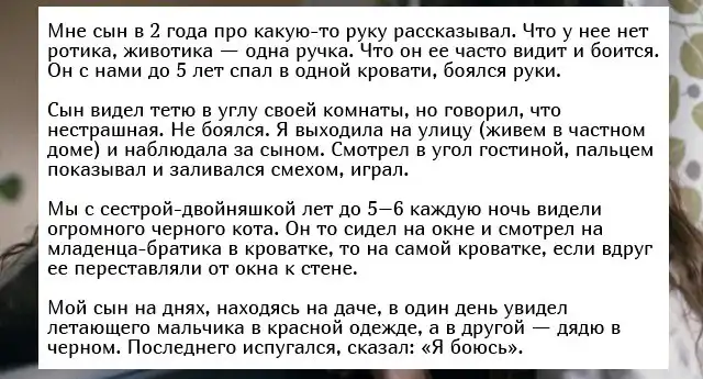 Бывало ли у вас такое, что ваш кот неподвижно сидит на одном месте и смотрит в одну точку, а затем начинает пятиться назад, как будто он что-то или кого-то увидел? К сожалению, животные не могут нам рассказать о том, что они видят, чего не скажешь о детишках, чьи рассказы порой леденят кровь. Хотите почитать такие истории? Тогда обязательно читаем.