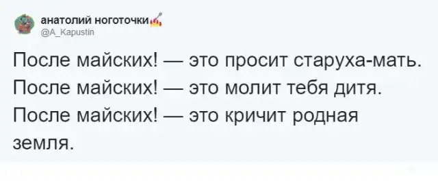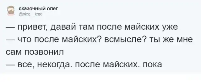 Многие из нас пытаются придумать какую-то отговорку, чтобы не делать те или иные дела прямо сейчас. Но теперь наступил тот самый момент, когда можно перенести любое дело всего одной фразой: "Давай после майских", которая даже стала настоящим мемом в Twitter. Эту фразу и действительно можно использовать в любой ситуации.