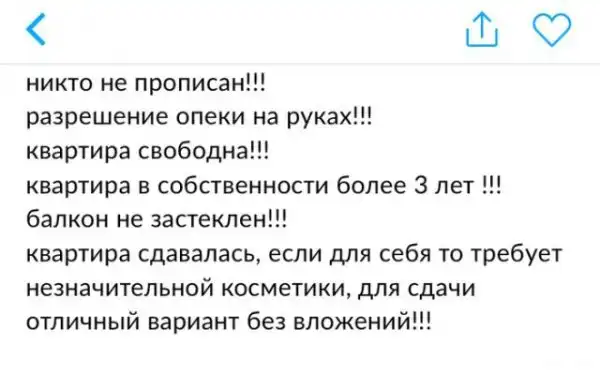 Видимо, продавцу этой квартиры уже так надоели перекупщики и простые зеваки, которые бесят бестолковыми звонками, что это объявление уже больше похоже на крик души, чем на желание продать недвижимость. И да, это абсолютно реальное объявление с одного из сайтов. Прочитав, создается такое ощущение, что на вас накричало объявление...