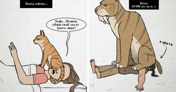 Создатели популярнейших ныне комиксов про Пикси и Брута из компании Pet Foolery порадовали нас своим сайд-проектом, где кратко, но ёмко, в своём стиле, указали основные различия между кошками 21 века и первыми одомашненными кошками, которые жили более 10 тысяч лет назад.