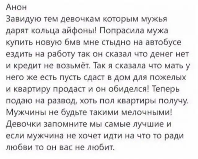 С каждым годом количество содержанок и халявщиц с запросами растет. Представляю вам примеры, доказывающие, что меркантильным дамам ничего в этой жизни не светит, кроме неуважительного отношения и одиночества. Они ждут богатых принцев, а в итоге остаются у разбитого корыта, потому что адекватным мужчинам нужны здоровые отношения!