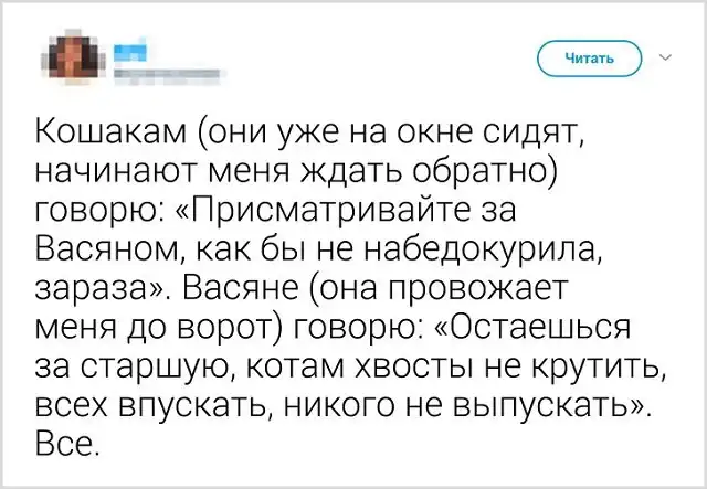 Однажды девушка по имени Тася Никитенко решила написать пост в соцети, в котором она попросила пользователей признаться, делятся ли они со своими питомцами планами на день. В итоге получился полноценный тред, где множество людей поведали, как они прощаются со своими котиками, когда собираются выйти из дома.