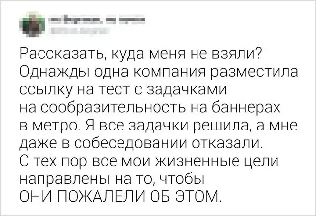 Собеседование - это мучительное мероприятие, на котором каждый человек должен проявить чудеса харизмы. Что только не приходится делать претенденту на должность, чтобы его взяли на работу. Но бывает так, что работодателю просто невозможно угодить... Давайте почитаем забавные мини-истории от пользователей, которых не взяли на работу по совершенно идиотским причинам.