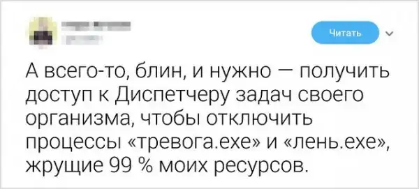 Ну что тут можно сказать? В вас ждет новая партия остроумных твитов от пользователей, которые знают толк в сарказме и остроумии. Пользователи поделились забавными мини-историями про владельцев машин и людей в туалетных кабинках, пьяных комаров и внутренних жаб, и многом другом.