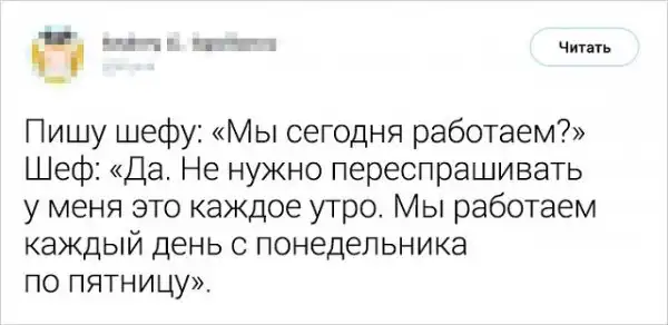 Время от времени мы устаем от долгих и тяжелых рабочих будней. Но есть и хорошие новости! Сегодня пятница и завтра наступают долгожданные выходные. А пока давайте оценим жизненные и остроумные твиты, в которых каждый работяга узнает себя.