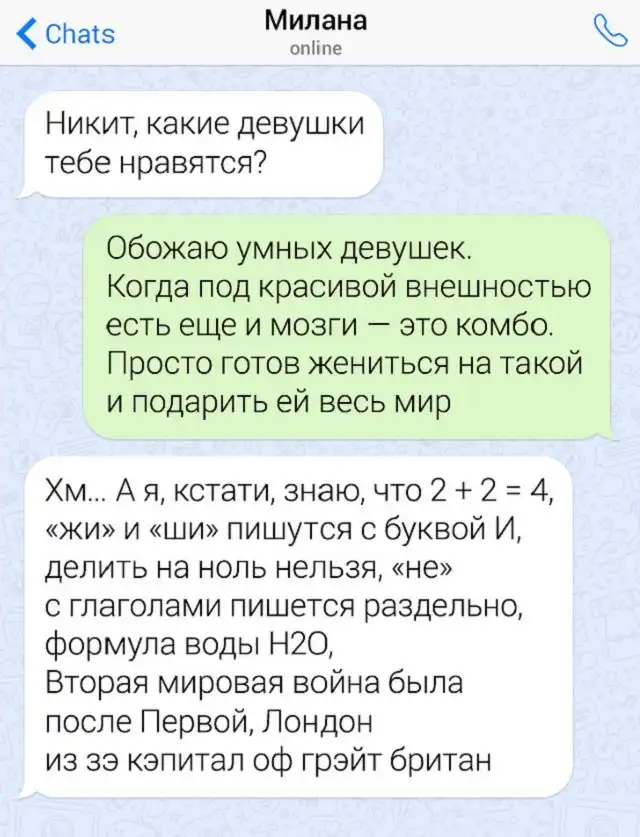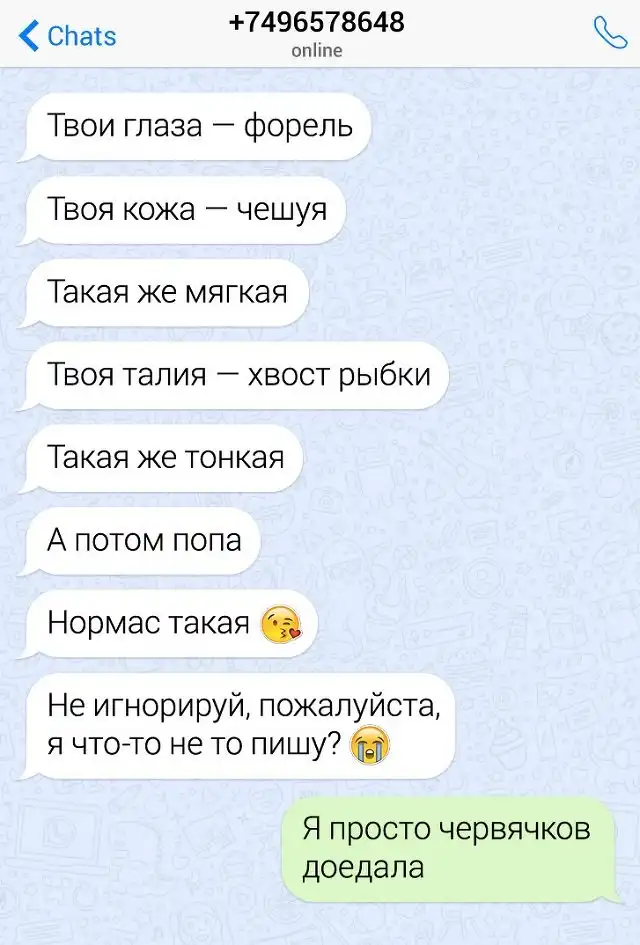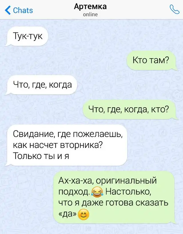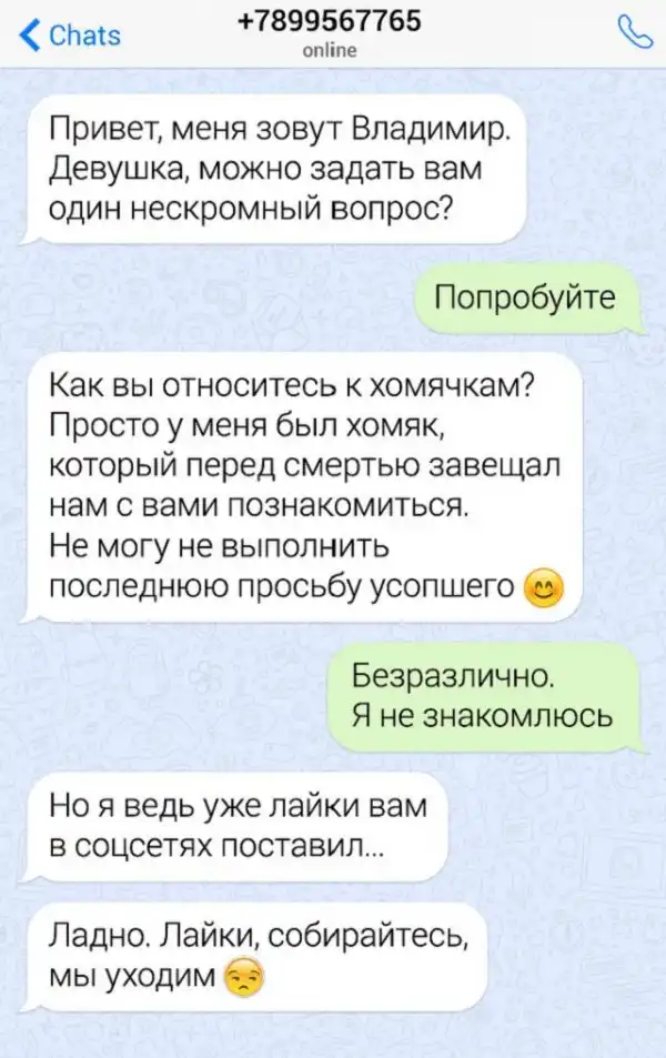 Мы живем в эпоху Интернета. Теперь даже самые простые вещи, например, сходить в магазин за продуктами, можно осуществить не вставая со стула. Пару кликов мышки и к вам домой спешит курьер. А из-за социальных сетей и сайтов знакомств парни практически перестали знакомиться с девушками в "реальном мире". С одной стороны это хорошая новость, поскольку девушкам станет проще отшивать сверхсамоуверенных "пикап-мастеров". Но гуру флирта не сдаются и регулярно штурмуют аккаунты женщин нелепейшими "подкатами". Хотя, стоит отметить, что иногда креатив парней срабатывает и девушки говорят заветное "да". Давайте посмотрим на подборку переписок, которые наглядно показывают то, как не надо флиртовать с девушкой.