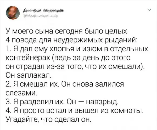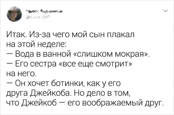 Капризные детки всегда найдут повод поплакать. То вода ванной слишком мокрая, то на ночь поцеловали не 5 раз, как всегда было принято, а 4! Молодой папа с ником "HenpeckedHal" решил поведать пользователям соцсетей о своем маленьком любителе "порыдать". Так начался небольшой флешмоб, в котором родители также захотели поделиться мини-историями о своих детях.