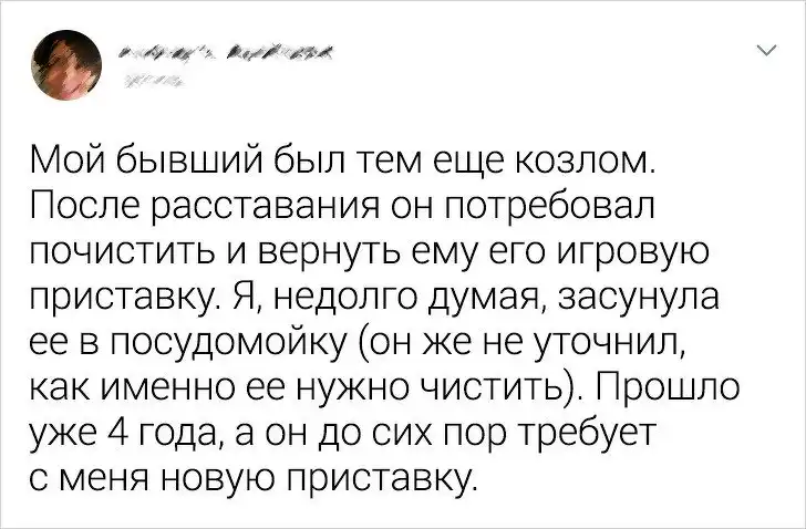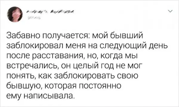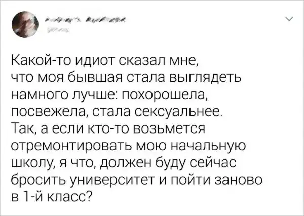 Разрыв отношений - не самый приятный период в жизни. Поэтому многие люди не хотят слышать о своих бывших ни единого слова. Но есть и те, кому становится легче, когда они выплескивают все наружу. Речь идет не только о всяческих обидах, но и про изрядную порцию шуток на эту личную тему. Предлагаем посмотреть подборку саркастичных твитов про бывших от пользователей, которые пережили болезненное расставание.