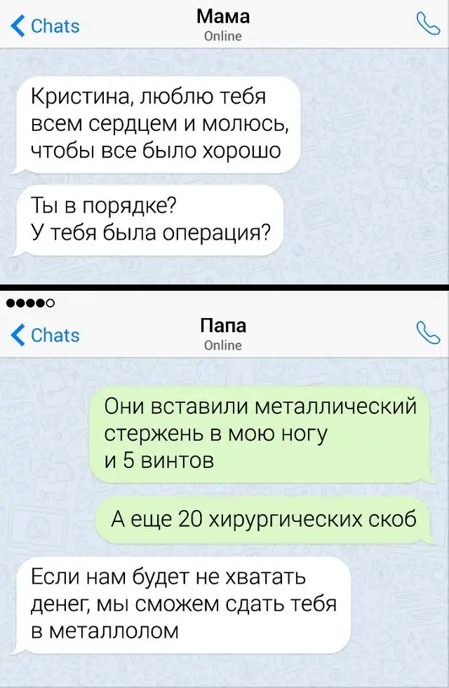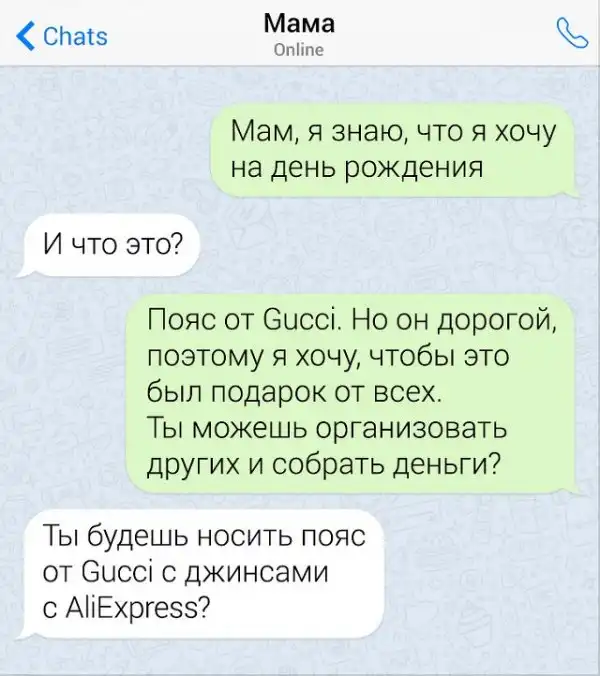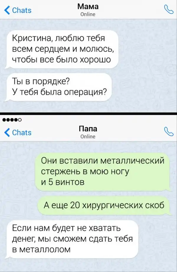 Переписки с родителями можно считать отдельным поджанром в СМС-искусстве. Они всегда смешные и имеют непредсказуемый финал. Благодаря остроумным мамам и папам получаются такие забавные подборки. Предлагаем посмотреть забавные переписки с родителями и оценить особую семейную атмосферу диалогов в мессенджерах.