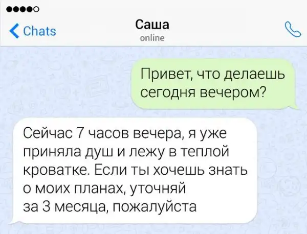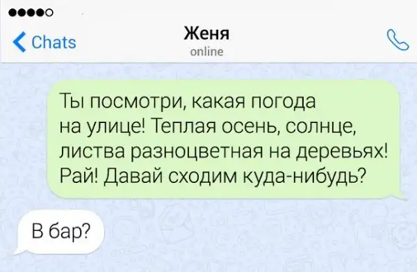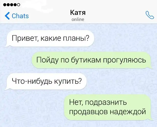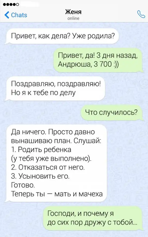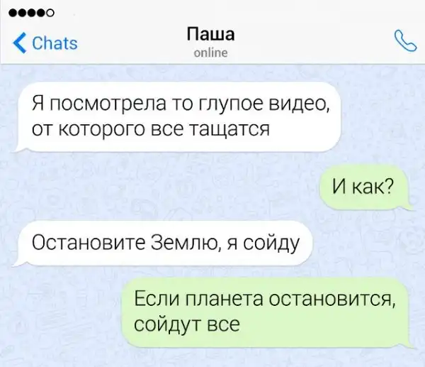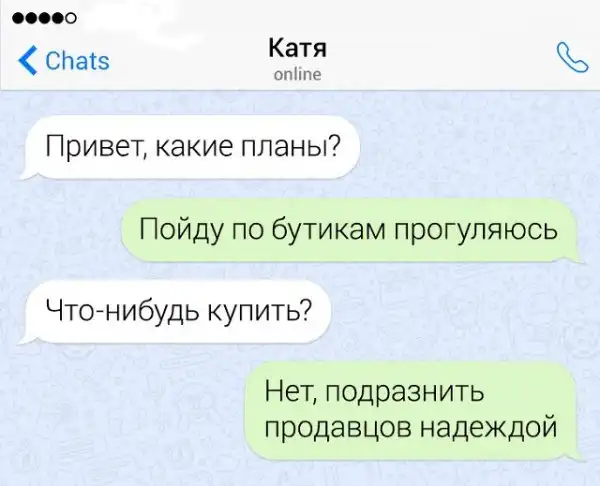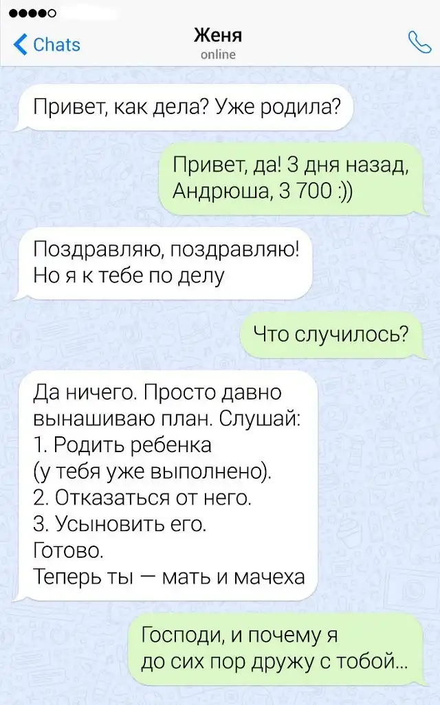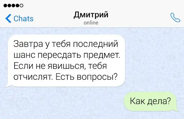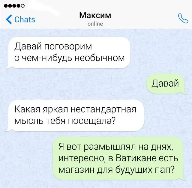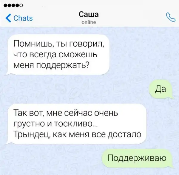 Если в человеке накопился сарказм, то его нужно срочно выплеснуть в свет. Чтобы не бегать по улице и не пугать прохожих потоком шуток, лучше всего зайти в мессенджер на своем смартфоне. Там можно вдоволь острить, шутить, и просто дурачиться. Предлагаем глянуть подборку забавных переписок от людей, которым срочно нужно "вышутиться".