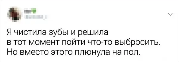 - Одним ранним утром я чуть было не вылил жидкость для полоскания рта на зубную щетку. Но я вовремя остановился, подумав: «Хорошая попытка, мозг». И положил все на место. Затем схватил тюбик с зубной пастой и... выдавил ее на ладонь. © hgrburningwrath