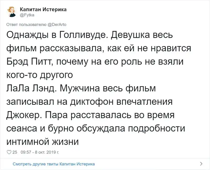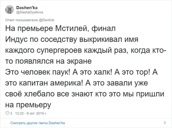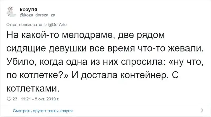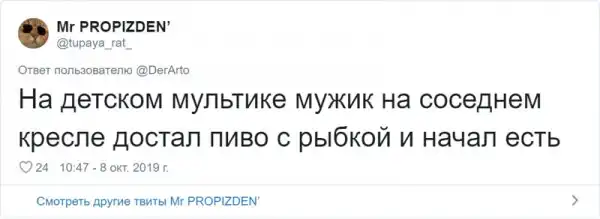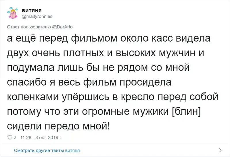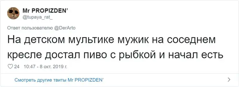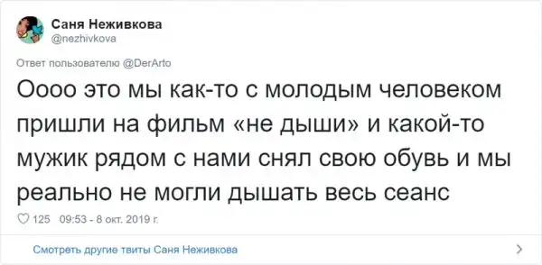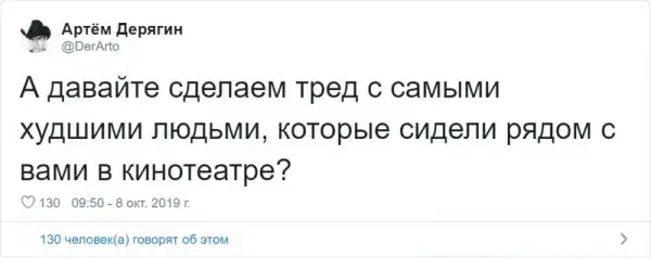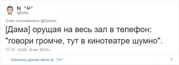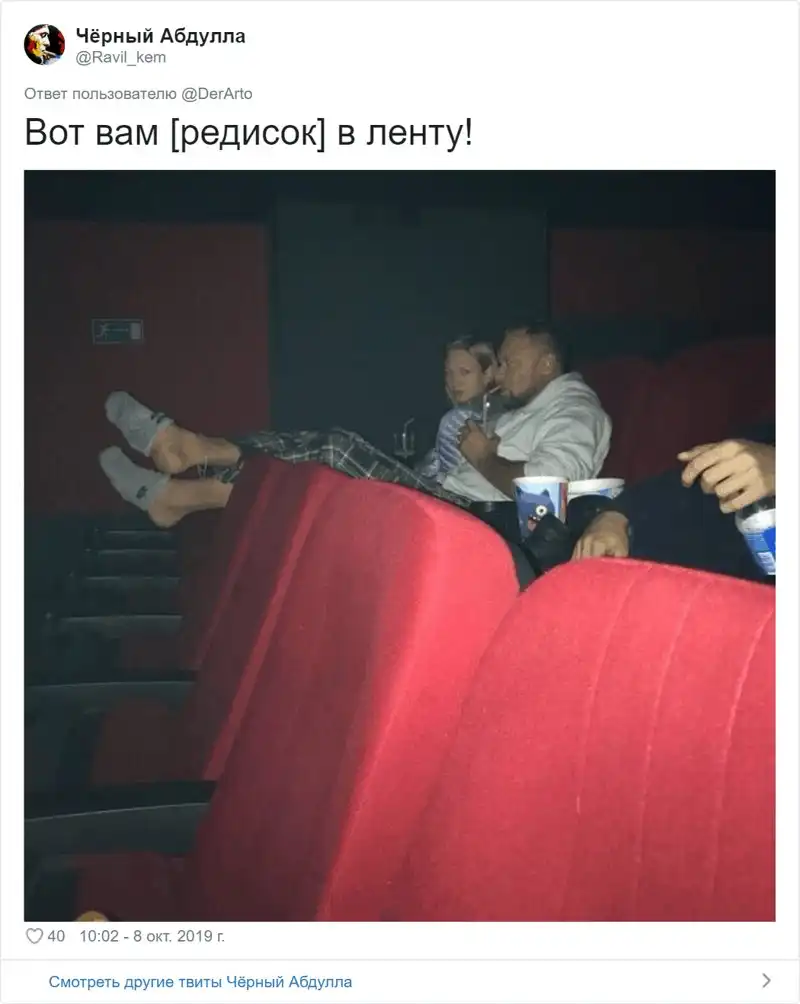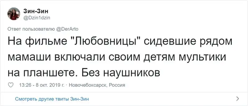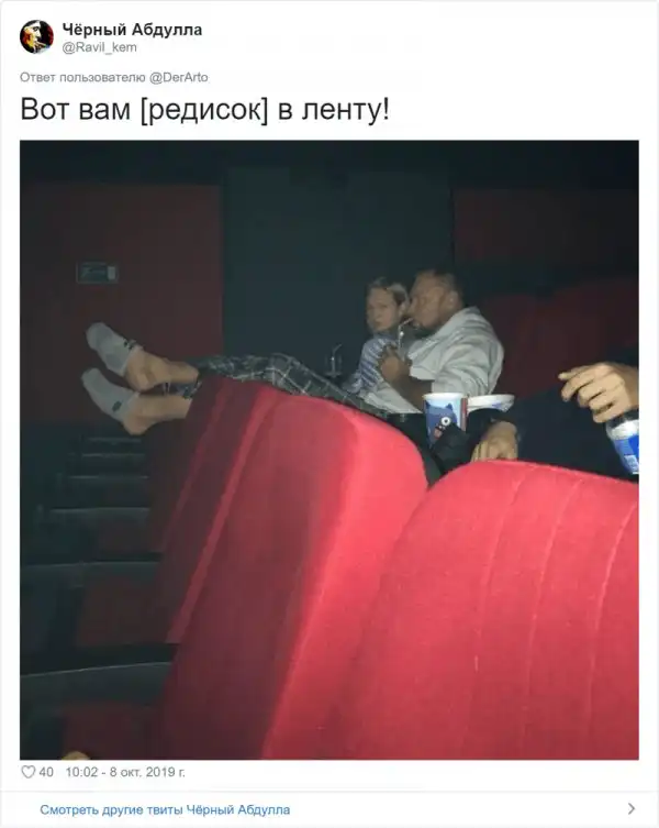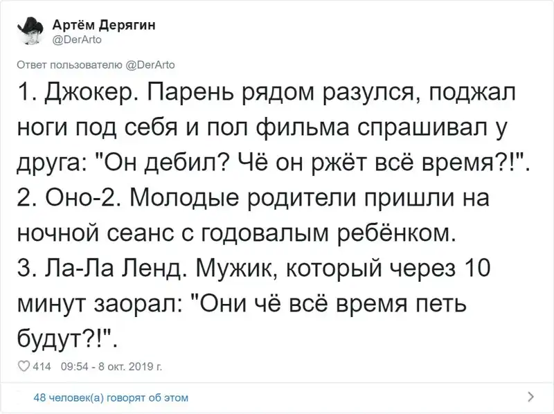 Казалось бы, хороший фильм, да ещё и при просмотре в кинотеатре сложно испортить — но вот тут могут поспорить бедолаги, которым достались не самые лучшие соседи по залу. Ведь для некоторых зрителей фильм становится только лучше, если его можно громко обсудить с соседом, заесть ароматной рыбкой и от души пнуть кресло соседа спереди.
