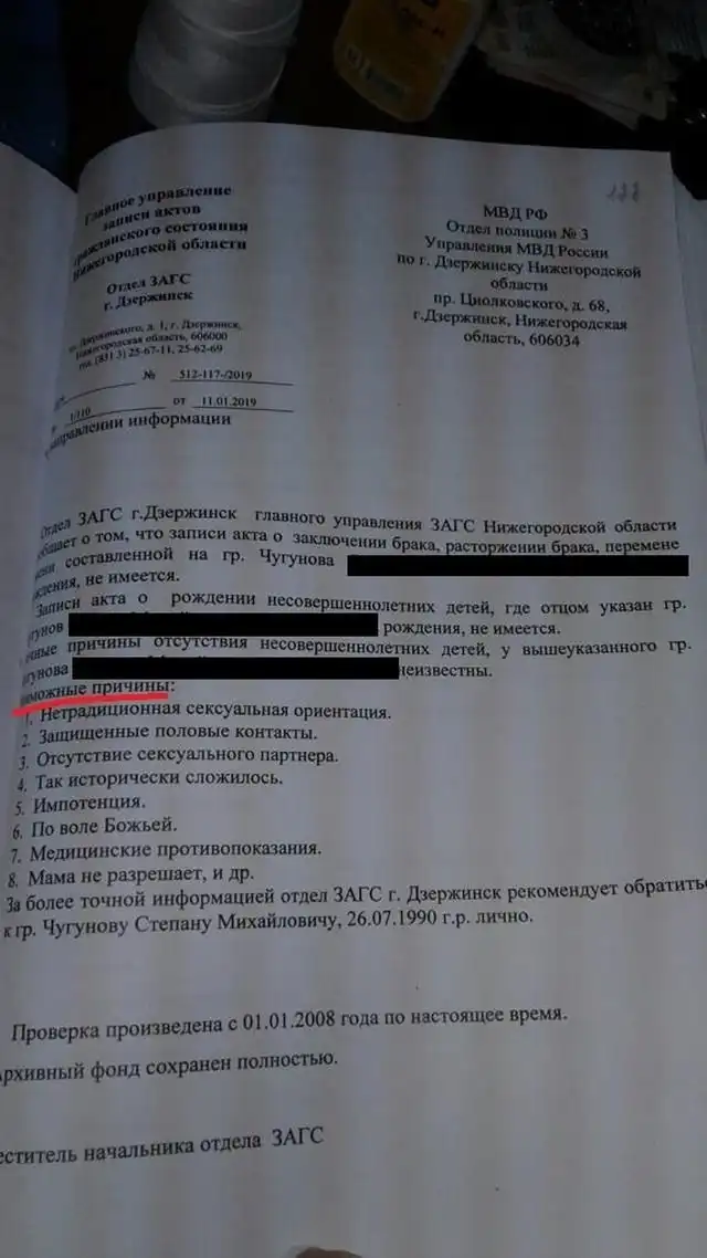 "Записи акта о рождении несовершеннолетних детей, где отцом указан гражданин Чугунов, не имеется. Точные причины отсутствия несовершеннолетних детей у вышеуказанного гражданина Чугунова неизвестны", - сказано в отчете.