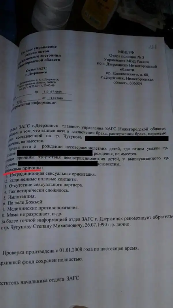 В социальных сетях Дзержинска активно обсуждают очень смешной документ, который предоставил местный ЗАГС для полиции. Защитники правопорядка расследовали одно уголовное дело и отправили запрос в ЗАГС с просьбой уточнить, есть ли у подозреваемого гражданина дети. С важным уточнением: "И если нет, то почему?". Полицейским предоставили достойный ответ.