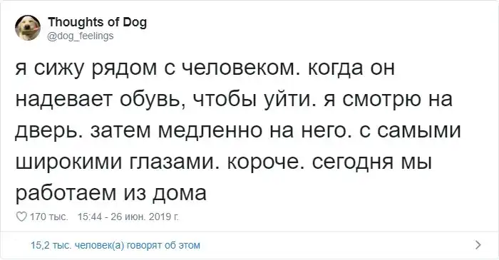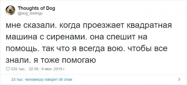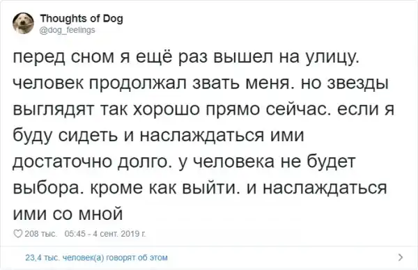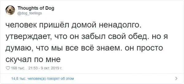 Вы никогда не задумывались о чем думает ваша собака? Что происходит в ее голове, когда она виляет хвостом и смотрит вам в глаза или когда носится по двору, словно с ума сошла? Необязательно уметь читать мысли животных, потому что в Твиттере есть аккаунт «Мысли собаки». Владелец этой странички ответит на все эти вопросы мило и с юмором.