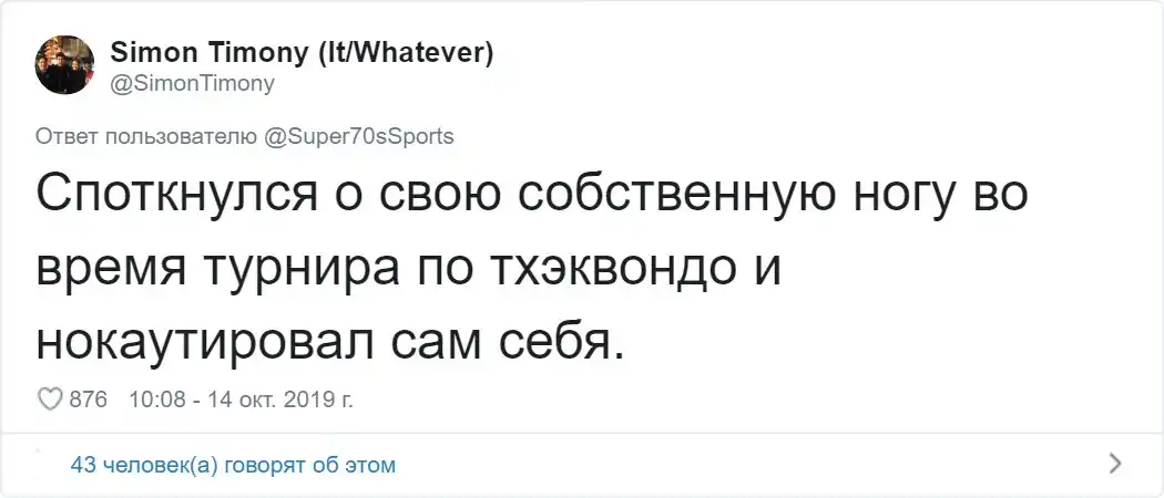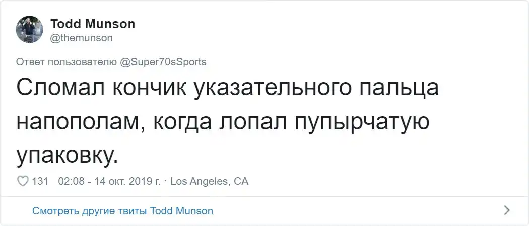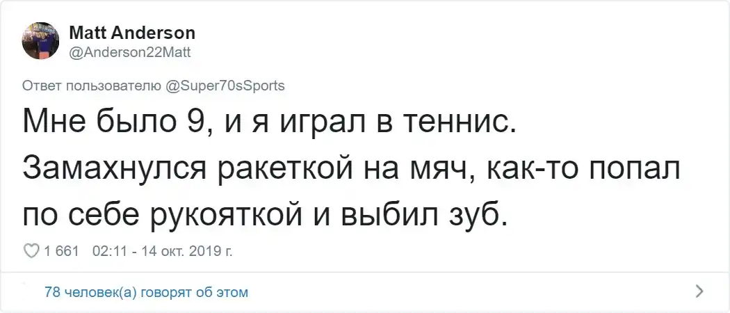 Пожалуй, у всех нас когда-то были неприятности, которые заканчивались вывихами, синяками, ушибами и переломами. Вспоминать о таких случаях, как правило, не очень приятно. Но порой, даже у такого неприятного события, как прелом, может быть забавная и дурацкая предыстория. Пользователь Твиттера с ником "Super70sSports" предложил подписчикам рассказать о самых глупых травмах, которые они когда либо получали.