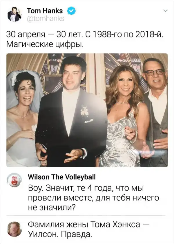 Крутой комментарий может завирусить любой пост. Даже, если ты пишешь коммент под твитом самого Тома Хэнкса. Знаменитый актер написал милый пост о 30-летней годовщине свадьбы, но вирусным он стал только благодаря одному остроумному комментатору. О чем идет речь, смотрите в нашей подборке новых юморных твитов.