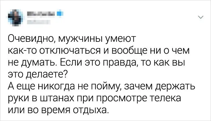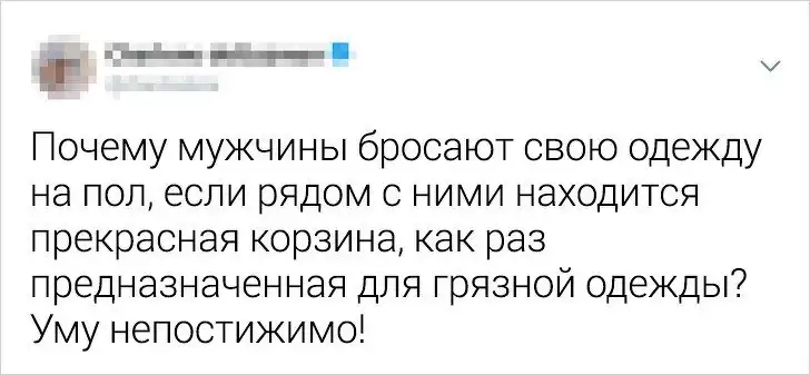 Существует огромное количество "житейских мудростей" и цитат, посвященные тому, что "понять женщину невозможно". Но редко, кто говорит о мужских причудах, которые девушки никак не могут понять. Например, почему мужчины никогда не бросают свою одежду в корзину для грязного белья и ни за какие деньги не воспользуется гигиенической помадой. Давайте посмотрим подборку твитов, в которых девушки рассказали, что они больше всего не понимают в мужчинах.