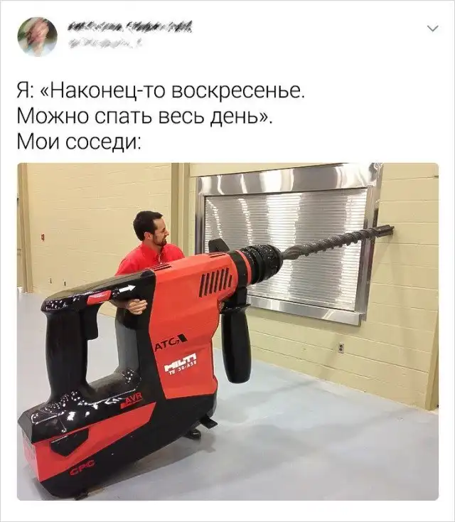 Мои соседи сверху после 24:00: «Надо поле притоптать. Надо дверью постучать. Надо дрелью пожужжать. Надо детям поорать». © mARia_isMY_name / twitter