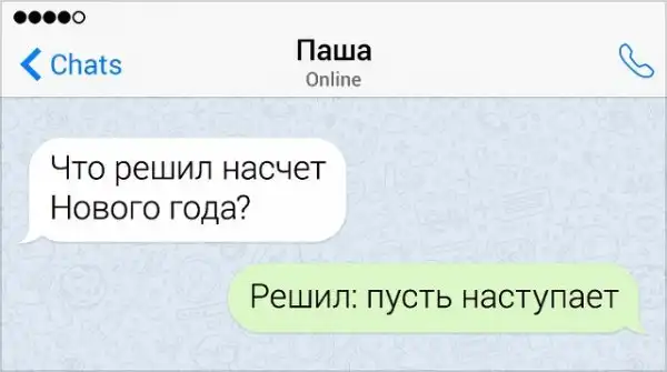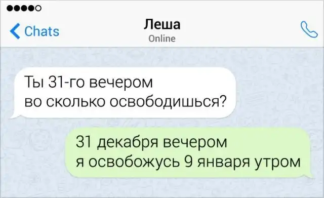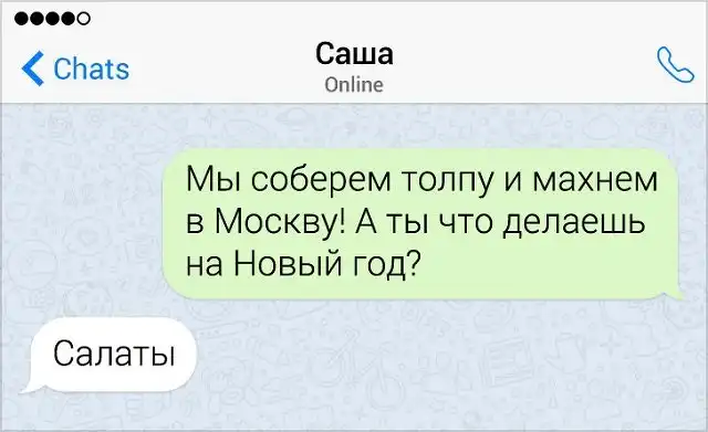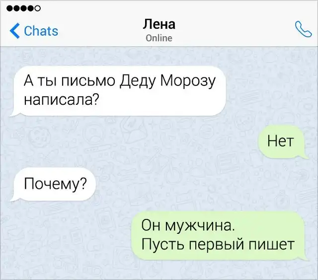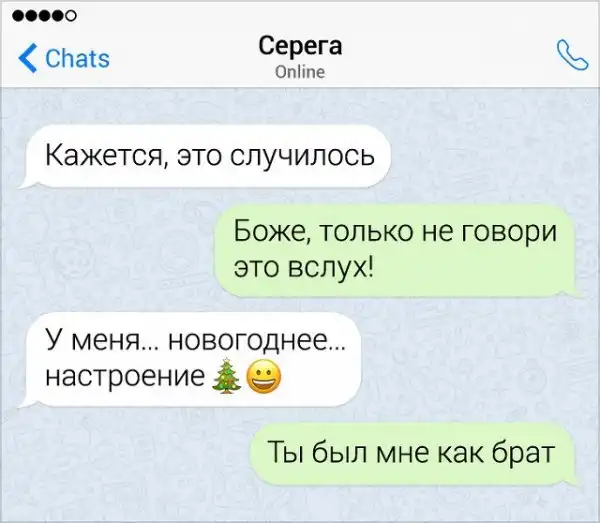 Новогодние праздники - это веселое и волшебное время, но также и очень трудное. Нужно успеть купить всем подарки, спланировать вечеринки и застолья, украсить квартиру, купить елку и еще множество других дел. А чтобы не сойти с ума от этой суеты, на помощь приходит чувство юмора. Предлагаем вам зарядится новогодним и веселым настроением в нашей подборке забавных переписок.