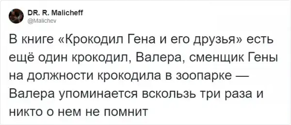 Эдуард Успенский написал замечательную детскую историю про Гену и Чебурашку, по которой сняли всеми любимый мультик. Спустя столько лет, эта история еще может нас удивить. В Твиттере провели расследование и узнали, что в мультике про Гену и Чебурашку был еще один крокодил - Валера. Но почему мы о нем ничего не знаем? Давайте посмотрим, что выяснили детективы из Твиттера.