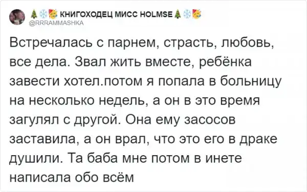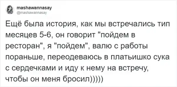 Ах, любовь, как прекрасно это чувство, особенно в "конфетно-цветочный" период. Но, увы, пары расстаются и всю радость заменяют горькие разочарования. Однако, далеко не все расставания - это шекспировская драма. Со временем многие пары осознают, что все было скорее смешно и странно, чем трагично. В итоге ночные излияния души о разбитом сердце плавно перерастают в анекдот. Именно такими случаями предложила поделиться пользовательница Твиттера с ником "Юсик". Давайте посмотрим.